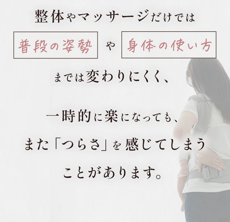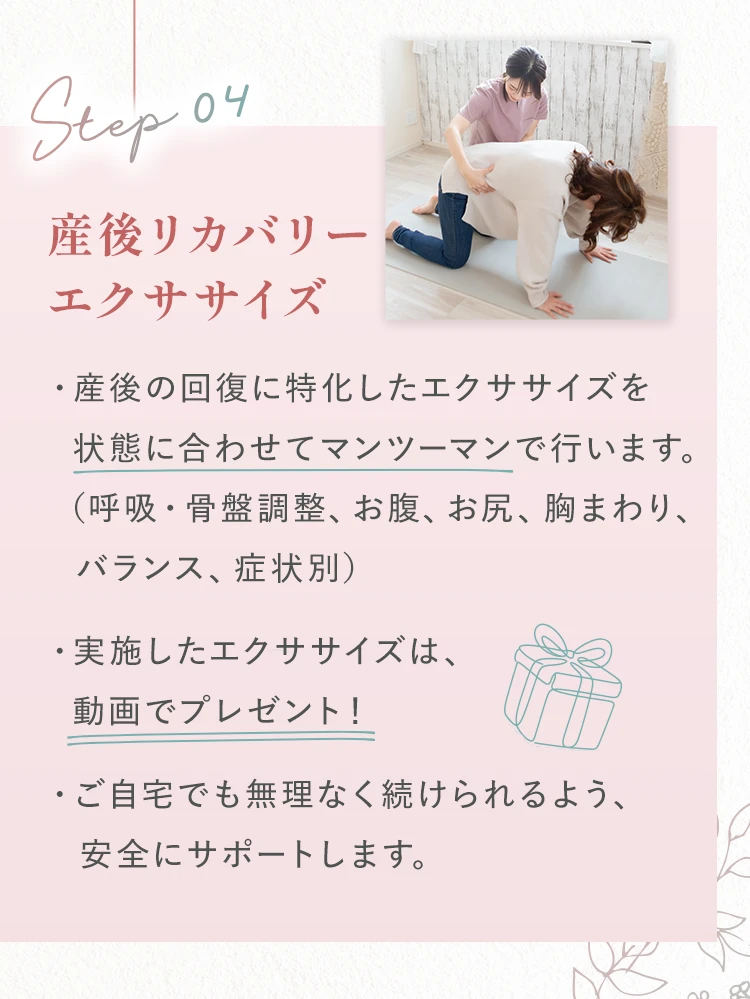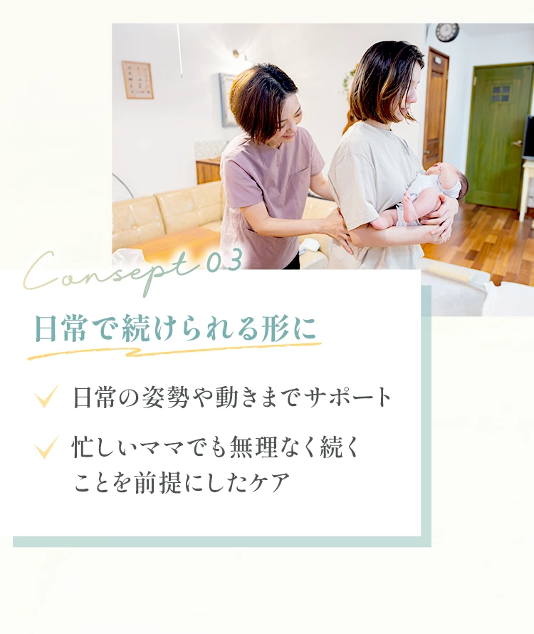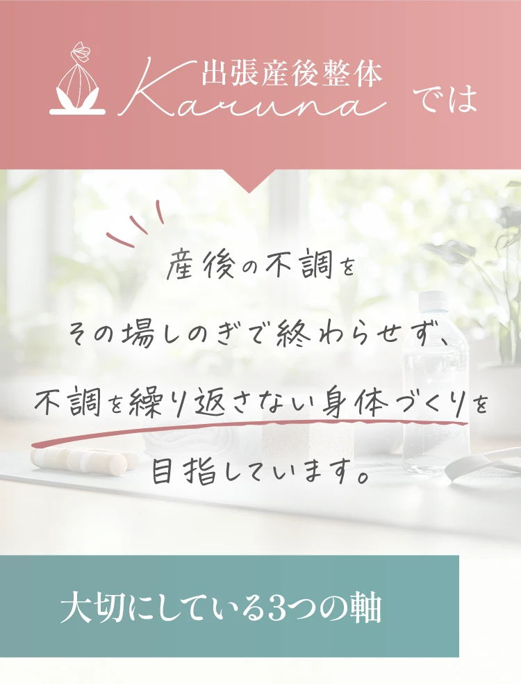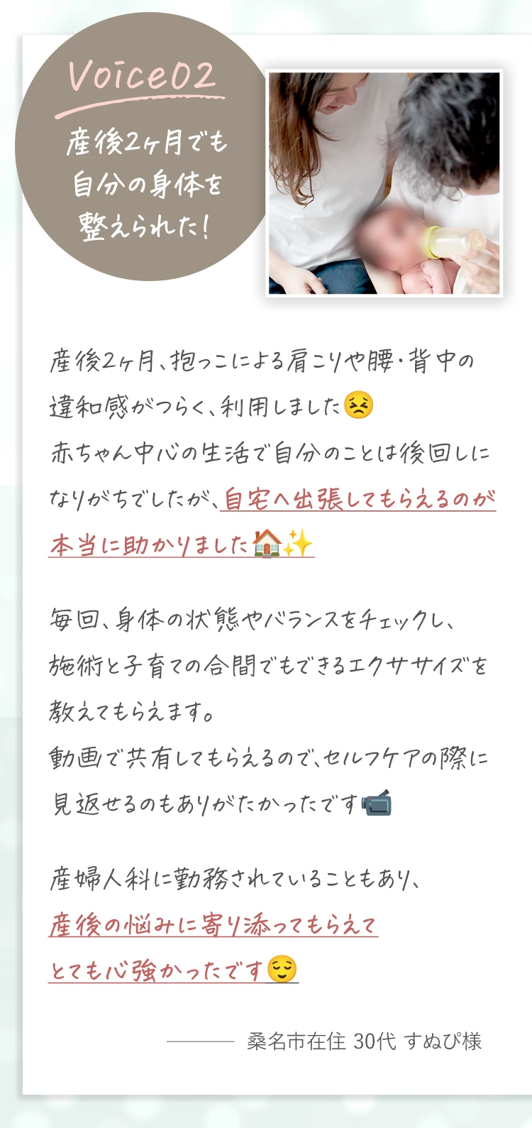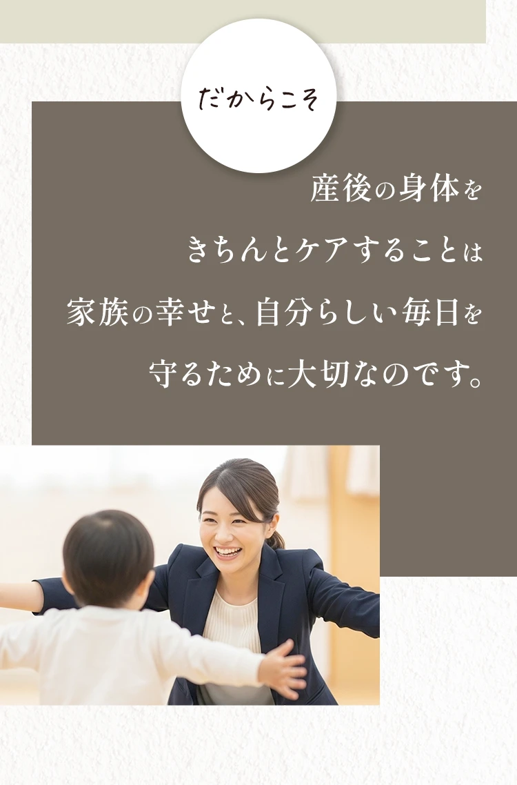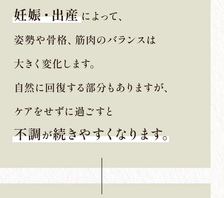 日常生活で傷みが強い、育児動作や生活に支障がある場合は1ヶ月検診前でもご相談ください。